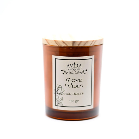 נר בניחוח ורדים אדומים - בכוס אמבר ומכסה עץ | 160 גרם