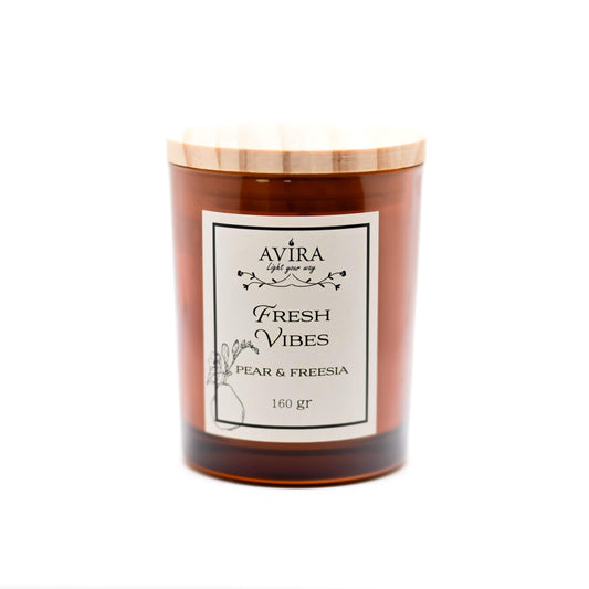 נר בניחוח אגס ופרזיה - בכוס אמבר ומכסה עץ | 160 גרם