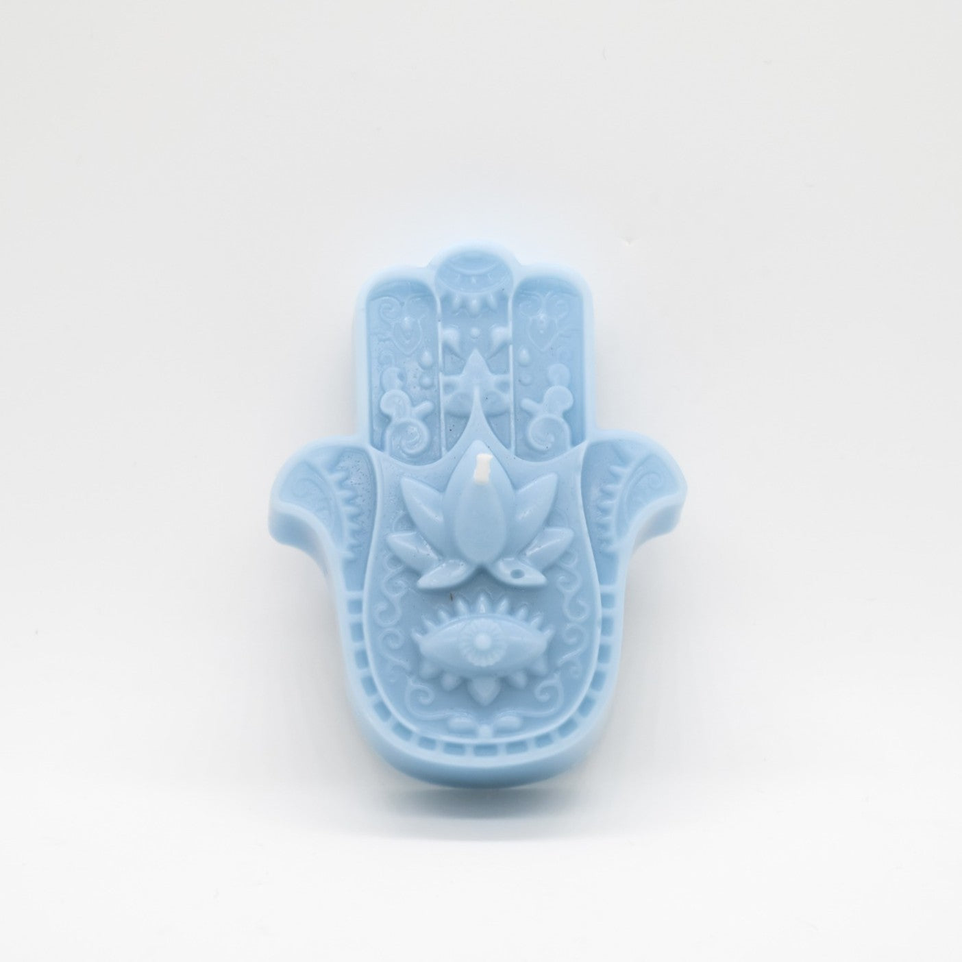 נר בצבע כחלחל עדין בניחוח נהר צלול, מעוצב בצורת חמסה ישראלית קלאסית!
